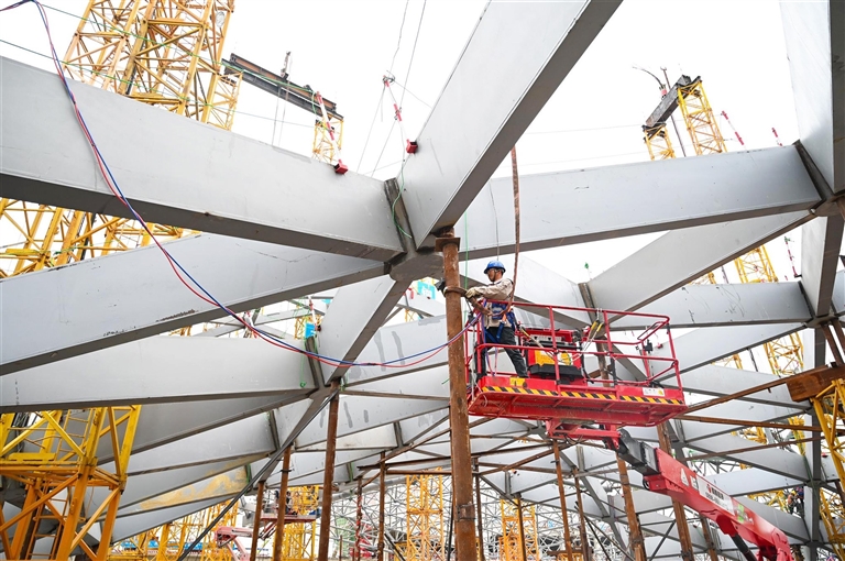 8月22日下午,三亚凤凰国际机场三期改扩建项目T3航站楼及配套工程施工现场,上百名建设者正在有序作业,敲打声、钢架焊接声等此起彼伏。
