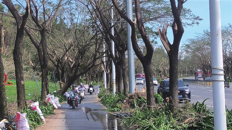 回想当时,湿滑路面裹着落叶断枝,还有歪着的树干“挡路”,陈滔骑车得格外小心:“25日那趟,我至少低头躲了20次,车速压在20公里 / 小时以下,就怕撞到头。” 可才过两天,路面残枝落叶几乎清干净了,“现在‘低头’次数少了,车也能骑得稳当些,三亚的清理速度很快,生活在这里很幸福。”