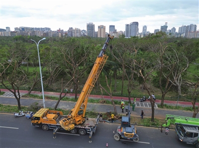 “台风过后,我们第一时间对全市的倒伏树木进行了排查,根据树木存活状态将受损树木分为三类,分别采取原地扶正、迁移栽种和清理回收等处置措施。”三亚市住房和城乡建设局副局长潘俊介绍,将综合考量树木的利用价值、生长环境及地下管线等因素,科学判定处理方式。对损毁严重、经专家评估确认难以存活的树木,将予以清理回收。
