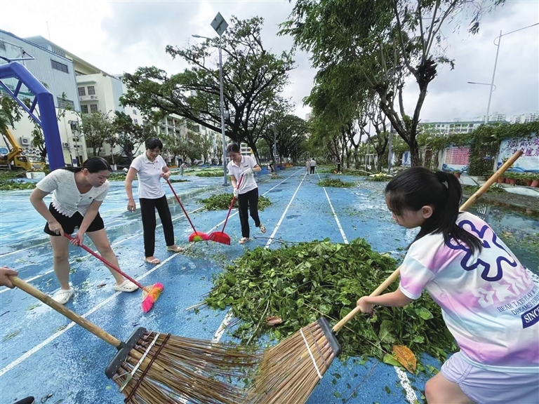 在市第七小学海罗校区,学校教职工分工明确,有条不紊地开展各项清理工作:大家对被台风损坏的树木进行扶正、加固,清理校园垃圾与杂物;为确保师生安全,学校还组织专人仔细检查教学楼、各功能室等场所的建筑结构和设施设备,及时排除各类安全隐患。