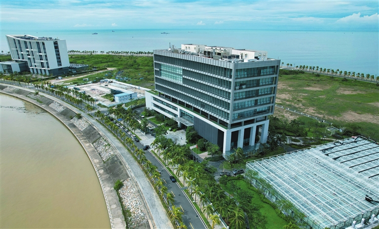 这是8月27日拍摄的三亚崖州湾科技城月亮岛综合实验室(无人机照片)。海口海关实验室总面积5.6万平方米,主要分布在海口、三亚,共有8栋实验室大楼。三亚崖州湾科技城月亮岛综合实验室是其中之一。