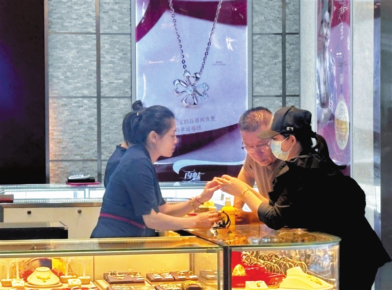“七夕”是我国传统节日中最具浪漫色彩的节日,作为中式情人节,为心爱的人挑选礼物是必不可少的心意表达。在蓝海购物广场,某黄金品牌专柜的导购员小张正给一对情侣试戴戒指。她告诉记者,七夕促销活动从8 月初就已启动,“每克黄金直降30元,还有满赠活动,这两天来挑选礼物的情侣比平日里多了不少。”