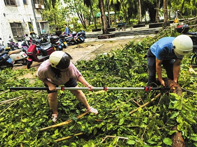 8月25日一早,暴雨未歇,三亚多个社区已呈现热火朝天的灾后恢复重建景象。台风“剑鱼”过后,多处树木倒伏、路障遍布,交通严重受阻。各村(社区)工作人员迅速集结,与包点单位、应急、园林、绿化等多部门并肩投入清障工作。