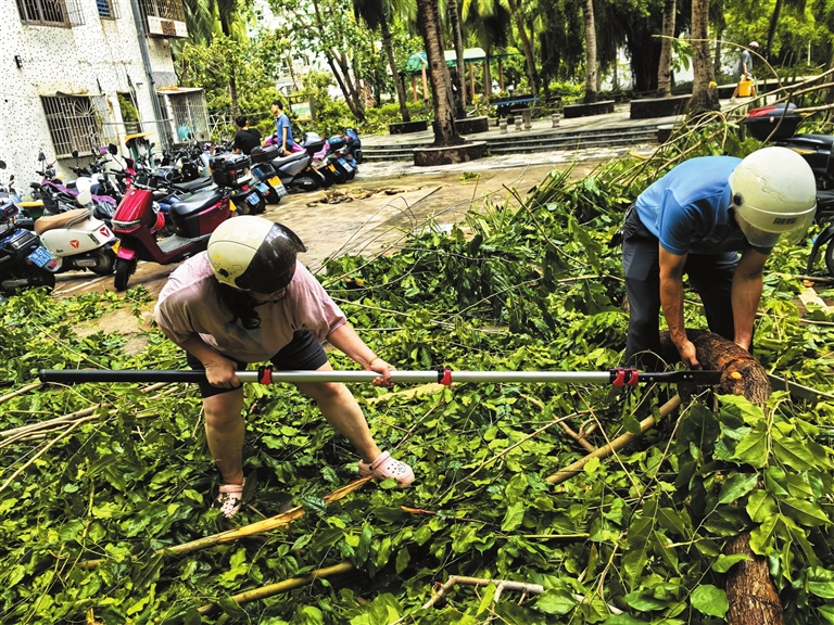 在吉阳区丹州小区教师村,孙明智和梁秋玲正与社区网格长、网格员一同修剪、清运倒伏树木。孙明智是市实验中学育才学校的物理教师,平日里就热心社区事务。台风前,他主动提醒邻里注意安全;灾后,又第一时间加入清理队伍。“我早已把三亚当作自己的家。社区受了‘伤’,我们每个居民都有责任为它‘疗伤’。”他一边挥动斧头砍除树枝,一边坚定地说,“只要大家齐心协力,一定能尽快恢复三亚的生机与活力。”