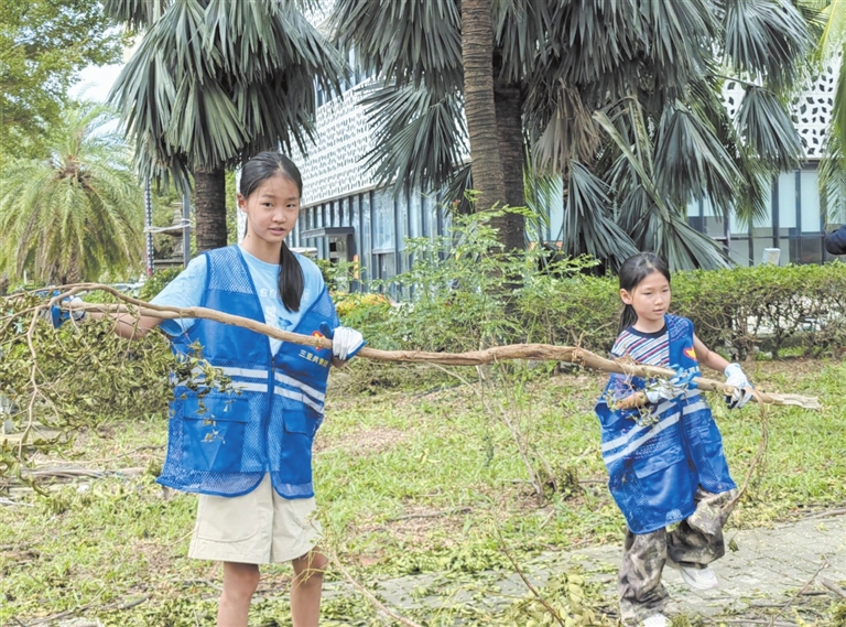 台风“剑鱼”过境,吉阳区干沟村的绿化带里还留着断枝落叶。8月27日上午,这里多了两个稚嫩又认真的身影——来自鲁迅中学巴哈马校区小学部的7岁和12岁小朋友,主动加入干沟村委会组织的清障队伍,当起了“小小清障员”。