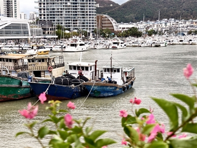 8月29日,三亚鸿洲游艇码头,众多游艇、渔船有序进港避风。