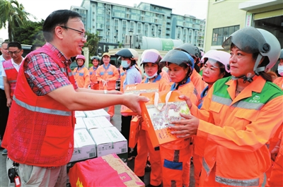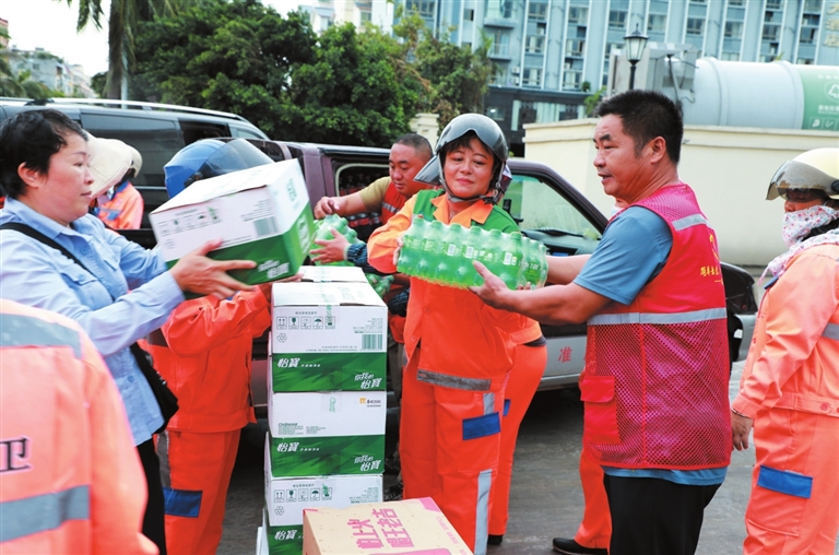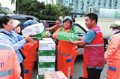 8月29日中午,在天涯区河西路春园垃圾转运站,三亚简爱义工社工作人员将矿泉水、饮料、月饼等爱心物资送到一线环卫工人手中。