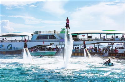 清凉的海上玩法,是今夏三亚最强劲的旅游吸引力之一。记者了解到,像萧思予这样专程为游艇出海而来的游客不在少数。三亚游艇订单量显著攀升,日均出海超过400艘次,客流量同比增长近三成。除游艇外,摩托艇、飞鱼等水上项目也广受欢迎。