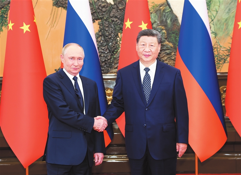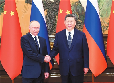 习近平指出,中俄两国元首相互出席对方国家举办的纪念世界反法西斯战争胜利庆典,充分彰显了作为第二次世界大战主要战胜国和联合国安理会常任理事国的大国担当,展示了维护二战胜利成果、捍卫正确二战史观的坚定决心。我提出全球治理倡议,就是要会同所有志同道合国家,坚定捍卫联合国宪章宗旨和原则,推动建设更加公正合理的全球治理体系。中俄两国都强调主权平等、国际法治、多边主义,要继续在联合国、上海合作组织、金砖国家、二十国集团等多边平台加强协作,携手推动构建人类命运共同体。