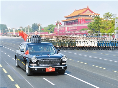 | 9月3日,纪念中国人民抗日战争暨世界反法西斯战争胜利80周年大会在北京天安门广场隆重举行。这是中共中央总书记、国家主席、中央军委主席习近平检阅受阅部队。新华社记者 李刚 摄 |
