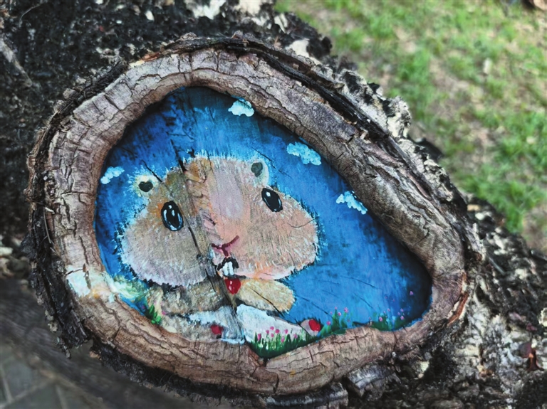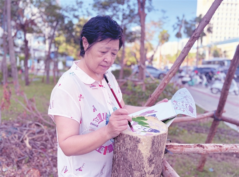 当天7时许,在迎宾路创作现场,72岁的李梦正俯身在一个树桩截面上画一群紧紧相拥的小兔子。“台风来时我们都在家躲着,窗外呼呼作响,真的很可怕。”她一边调色一边说,“台风后满目疮痍,但灾后三亚全力以赴恢复家园,我想通过手中的画笔,画出抵抗风雨的勇气,也画出对这座城市的爱,希望三亚会更好。”