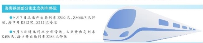 本报讯(记者 赵庆山 通讯员 王羽晴)记者从海南铁路了解到,受热带气旋影响,海南铁路部分进出岛列车停运:9月7日三亚开出岛列车Z502次、Z8008/5次停运,海口开K512次、Z112次停运;9月8日进岛列车全部停运,三亚开出岛列车K458次、海口开出岛列车Z386次停运。