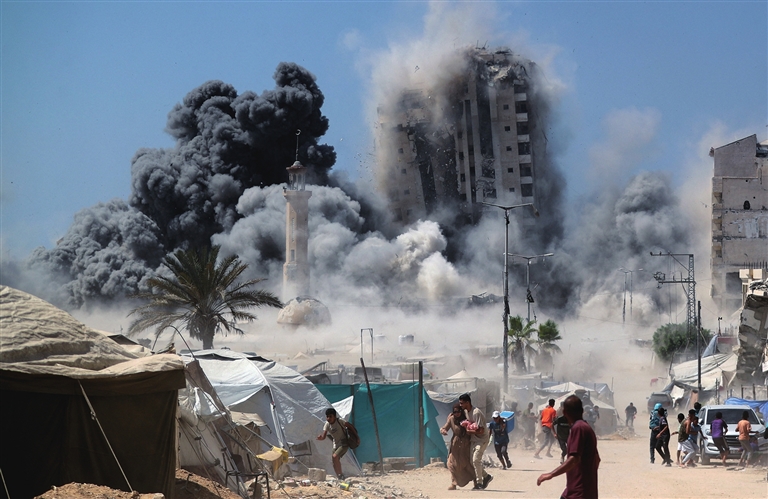 9月5日,在加沙地带北部加沙城,一栋建筑遭以军空袭后升起浓烟。