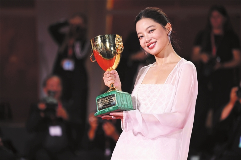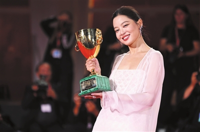 | 9月6日,在意大利威尼斯,辛芷蕾夺得第82届威尼斯电影节最佳女演员奖。新华社记者 李京 摄 |