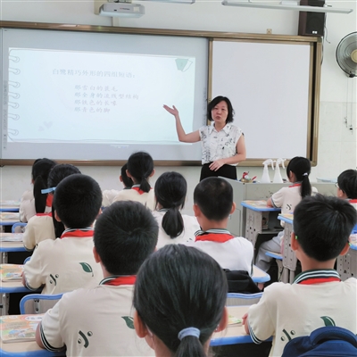 9月8日上午,学校上课铃声响起,手拿教案的陈瑞玲走上讲台。不一会儿,教室里的气氛热烈起来,通过两道语文习题的讲解,她将课堂氛围调动得兴味盎然,同学们争先恐后回答问题。