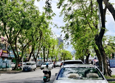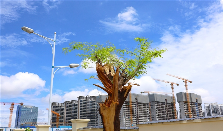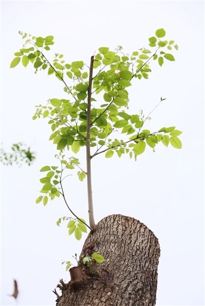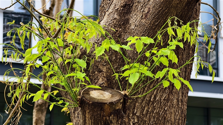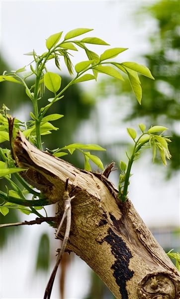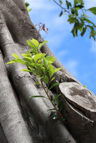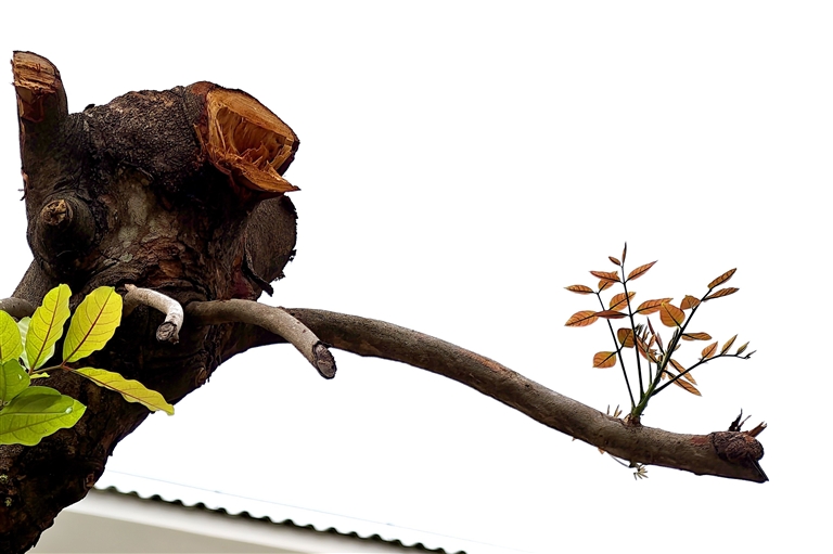 | 凤凰路的一隅,被切割后的树干并未沉寂,嫩绿的新芽从木质间钻出来,用生命的色彩诉说着三亚的坚韧。 |