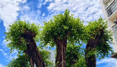 | ▲在荔枝沟社区大院,一棵小叶榕树长出茂盛的枝条。 |