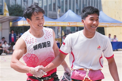 新华社长沙9月10日电(记者 谭畅)印度尼西亚国家攀岩队速度组日前在长沙训练、比赛,备战2025年攀岩世界杯贵阳站比赛。10日上午,印尼队与伍鹏、邓丽娟等中国名将所在的湖南黄金攀岩队进行友谊赛,两项冠军均归属印尼选手。