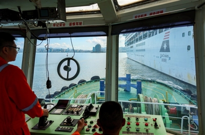 这一待,就是将近9个小时。其间,许清林一边与外籍船长Eric Dahlberg等人沟通“领航星”号的航向、靠泊、停锚等操作,一边与引航船保持联系,叮嘱船员们要在17时前驶回凤凰岛国际邮轮港码头,协助“领航星”号离泊。