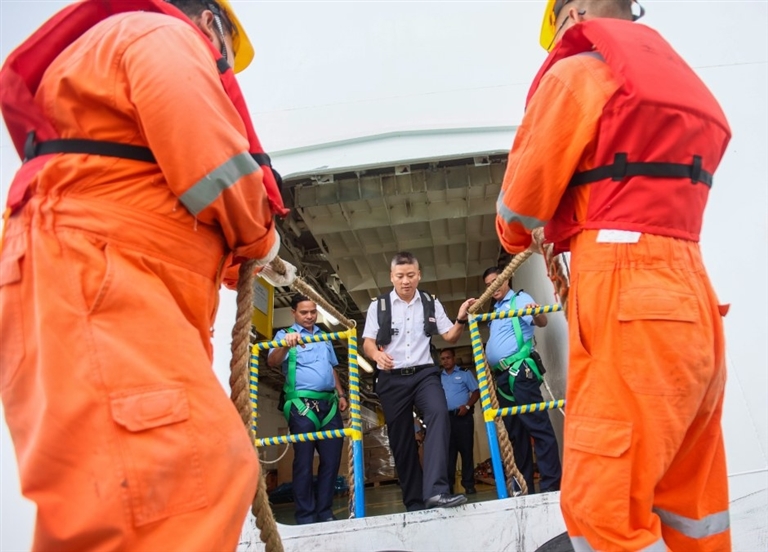 “过去,我执行过很多有难度的引航任务,这些过程中,往往危机四伏。考验之一,是登离船时攀爬引航梯。”许清林介绍,一截长度达9米的软梯从船杆处抛下,引航员要贴着船舷侧板,一路攀爬上去。