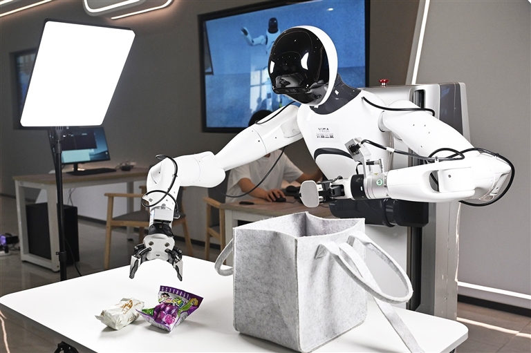 9月12日,在签约现场展示的一款具备原生数采能力、采推一体的通用具身智能机器人,可适配工业、商业、家庭等多场景作业需求。 本报记者 李学仕 摄