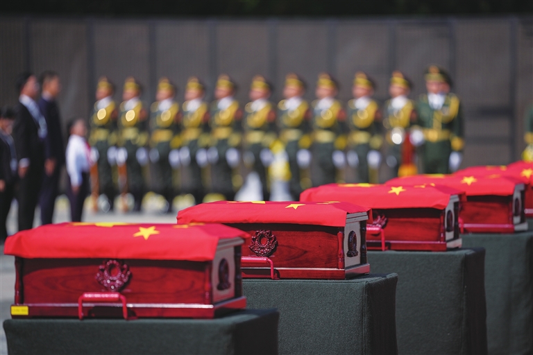 10时许,仪式正式开始,军乐队奏响婉转低回的《思念曲》,两侧标兵持枪肃立,礼兵护送志愿军烈士遗骸棺椁缓步进入纪念广场,全场奏唱中华人民共和国国歌。致祭文后,全体人员向志愿军烈士遗骸三鞠躬。27名礼兵连续鸣枪12响,向志愿军烈士致以崇高敬意。