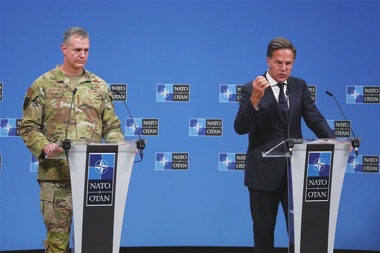 9月12日,北约秘书长吕特(右)和北约欧洲盟军最高司令亚力克苏斯·格林克维奇在位于比利时布鲁塞尔的北约总部出席新闻发布会。