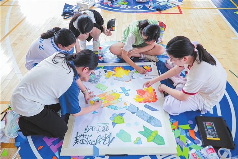 另一边,来自三亚市第九小学的吴剑南正在认真创作,浅粉、鹅黄的三角形层层叠叠拼成珊瑚丛,深绿色平行四边形拼成海龟壳,“大家一起完成作品,非常有成就感,希望我们的‘海底世界’能取得好成绩。”