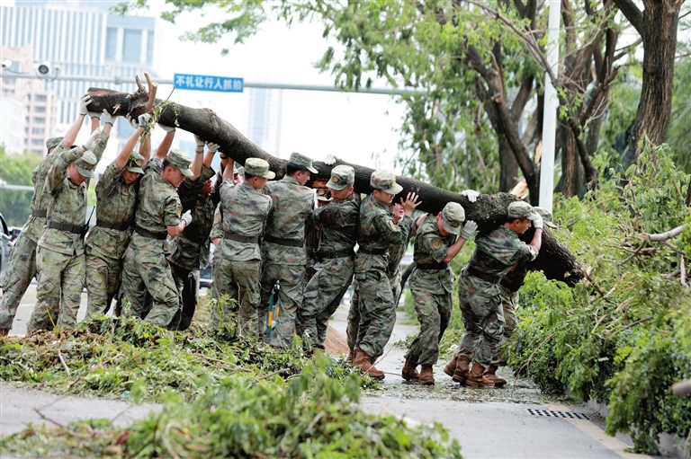 | 8月26日上午,台风“剑鱼”过后,海军某部迅速响应,派出100余名官兵携带油锯、铁铲等工具展开紧急清障。这是官兵齐心协力将倒伏行道树扛起挪走。 本报记者 袁永东 摄 |
