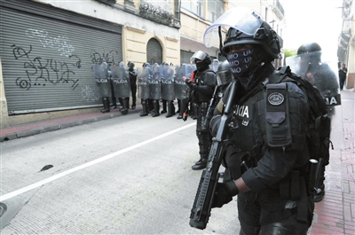9月16日,在厄瓜多尔首都基多,防暴警察在街头警戒。