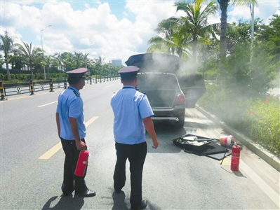 “多亏你们及时出手,不然我的车和人都危险了!”近日,在三亚鹿城大道与海润路路口附近,车主李先生紧紧握住市综合行政执法局吉阳分局(简称“吉阳分局”)执法队员的手,连声道谢。原来,他驾驶的车辆突发自燃,危急时刻,正在巡查的“执法蓝”化身“消防员”,迅速扑灭火情,避免了更大损失。