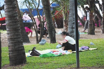 近日,三亚湾,一位女士在绿化带上野餐,让青青草坪受到伤害。