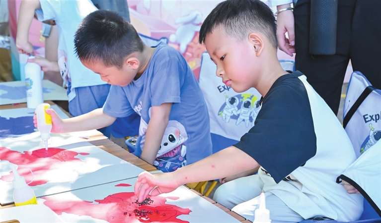 作为本次活动的“文化主角”之一,非物质文化遗产五谷粮食画自带厚重底蕴——其以常见谷物为墨、以匠心为笔,将生活气息与艺术美感巧妙融合。活动现场,一张张勾勒清晰的中国地图模型整齐铺开,大米、小米、黄豆、绿豆和红豆等创作材料在一旁错落摆放,吸引了孩子们好奇的目光,不少家长忍不住提前拿起谷物,和孩子轻声讨论如何搭配色彩。
