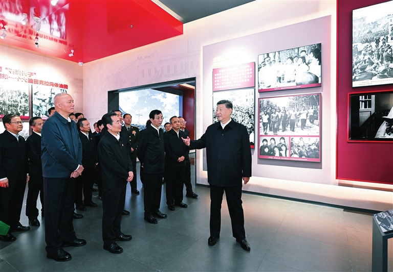 新疆维吾尔自治区成立时的历史视频,十月拖拉机厂生产的第一批拖拉机,天山百货大楼内的复原场景,打赢脱贫攻坚战的新旧对比照片,铸牢中华民族共同体意识宣传教育的展板,自治区扩大对外开放的口岸分布图……习近平认真听取讲解,不时驻足察看,详细询问有关情况。他指出,新疆70年主题成就展充满正能量,令人振奋。要精心组织观展,通过新旧对比,用鲜活的事实进一步凝聚人心、凝聚力量,激励新疆各族干部群众铸牢中华民族共同体意识,在共同富裕的道路上不断创造幸福美好生活。