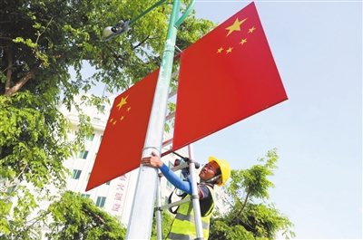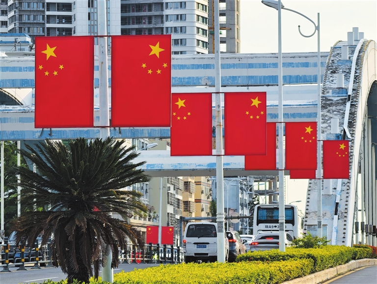 9月25日,随着国庆中秋“双节”的脚步日益临近,三亚市的大街小巷陆续换上了节日的 “盛装”,一面面鲜艳的五星红旗被悬挂在街头,营造出浓厚的国庆氛围。