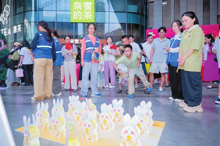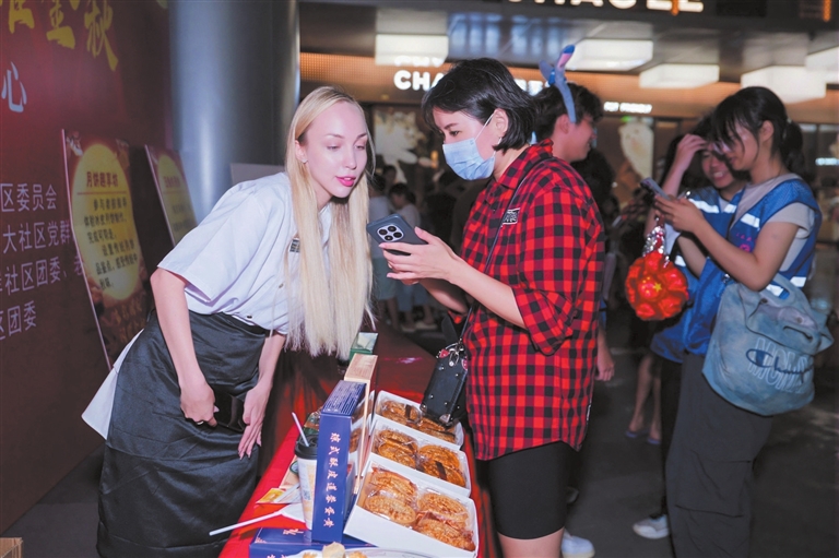 文化体验区同样热闹非凡。在“月饼趣享坊”内,市民游客亲手制作冰皮月饼、品尝传统月饼,感受中秋传统韵味。现场还设有“月宫投壶乐”、“嫦娥套月兔”等游戏,欢声笑语不断。来自乌克兰的Nasty(思娅)主动担任志愿者,热情邀请市民游客品尝月饼。她表示,自己在三亚生活了8年,这是首次参加此类活动,不仅玩得开心,还深刻感受到中国传统节日的魅力。