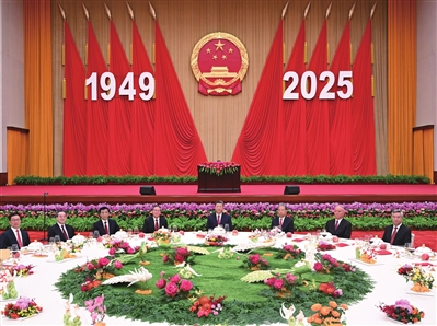 人民大会堂宴会厅华灯璀璨,洋溢着喜庆热烈的节日氛围。主席台上方高悬着庄严的国徽,“1949-2025”大字年号在鲜艳红旗映衬下格外醒目。