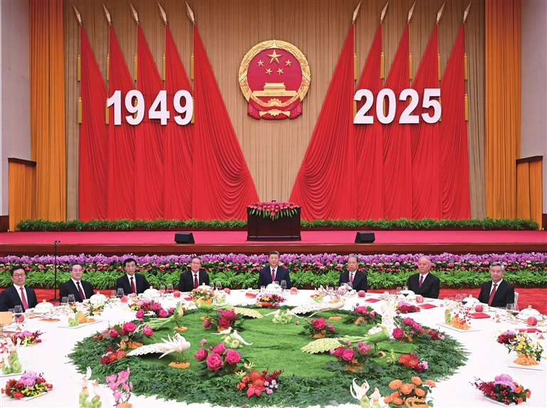 在欢快的乐曲声中,中外宾朋举杯共贺中华人民共和国成立76周年,祝福中国繁荣昌盛、人民幸福安康,祝愿中国人民和世界各国人民友谊长存。