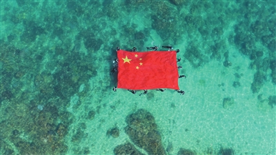 蜈支洲岛旅游区工作人员在碧蓝海面上展示巨幅国旗,用独特的海上仪式传递对祖国的祝福。 本报记者 陈聪聪 通讯员 陈宏 摄