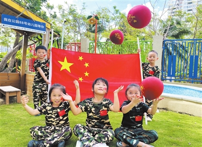 幼儿们展示五星红旗,欢庆国庆。