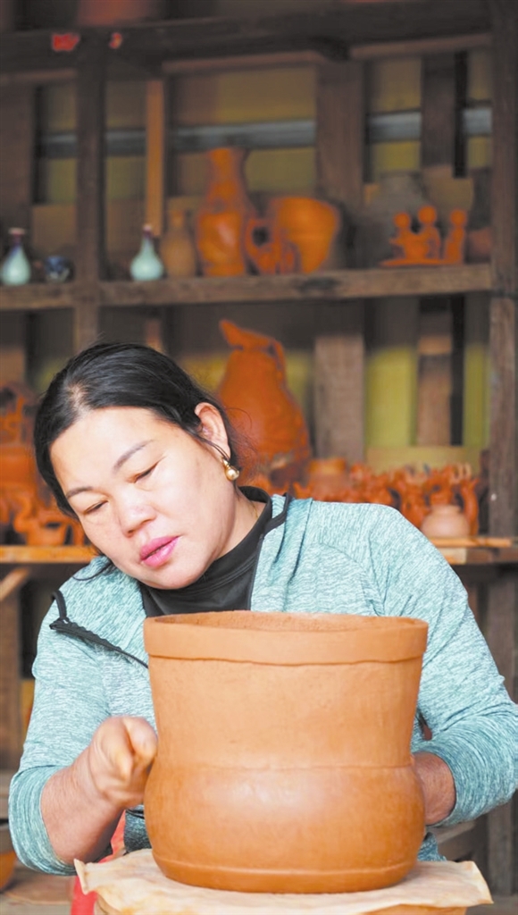 展示架上,神牛陶的犄角弯得遒劲,仿佛下一秒就要迈开蹄子;大力神陶的肌肉线条鼓着劲儿,手掌张开,像是能托住整个村寨的烟火;蒸饭锅的肚子圆滚滚的,锅沿压出波浪纹。“以前黎家人上山劳作,就用这个蒸饭,柴火一烧,饭香能飘出很远。”现场工作人员介绍。