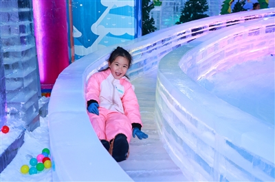 左图:10月1日,三亚湾壹号的海岛冰宫冰雪世界里,小朋友在冰雪滑梯上玩得不亦乐乎。