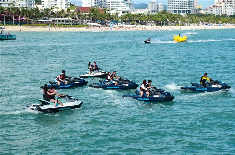 上图:在大东海旅游区水上项目中心海面上,游客体验摩托艇项目。