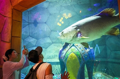 10月3日,在三亚·亚特兰蒂斯水族馆内,游客在欣赏海洋生物、参与互动活动中,感受海洋保育与节日欢乐并存的独特氛围。