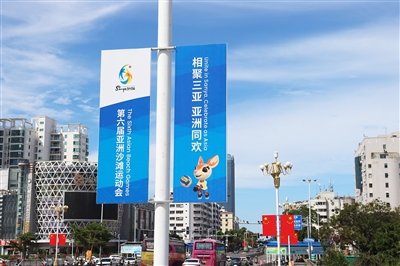 左图:10月2日,新风桥灯杆上悬挂的三亚亚沙会宣传海报。