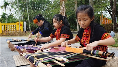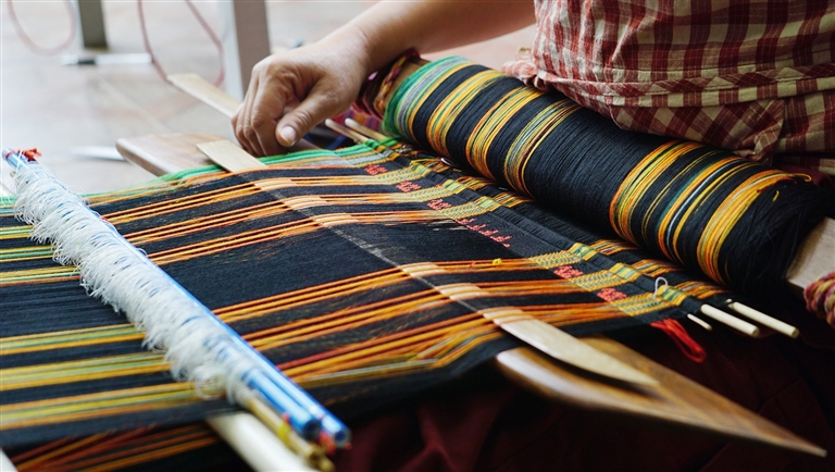 一张草席,席地而坐,老人们腰系传统踞腰织机腰带,足蹬织机经轴,左手引纬线在经线中来回穿梭,右手持打纬刀打紧纱线。年幼的吉菊莲虽然没掌握织锦的娴熟技艺,但她会在母亲的指导下,帮助长辈们脱棉籽、纺线、煮线、染色。