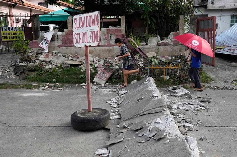 10月2日,在菲律宾宿务省博戈市,人们经过因地震受损的道路。