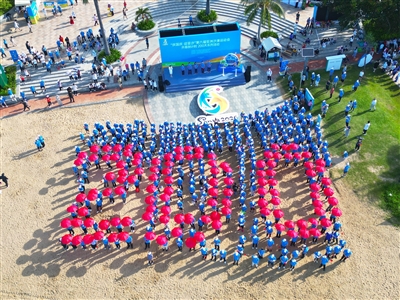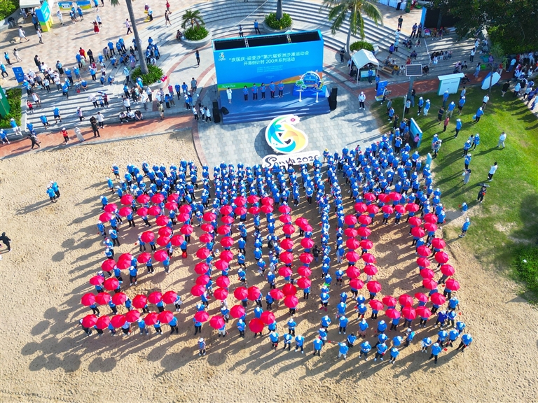 200名志愿者在沙滩上列队,组成醒目的“200”字样。本报记者 李学仕 摄