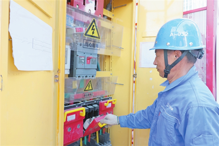 在临时用电箱前,机电班班长邓应存正仔细检查电路。这位31年党龄的老党员,是项目上名副其实的“老机电”,曾参与过海航国际广场、万宁希尔顿酒店等多个“鲁班奖”地标项目的建设。