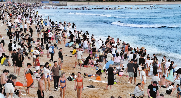 10月6日,在三亚市大东海景区,市民和游客在海滩戏水。
